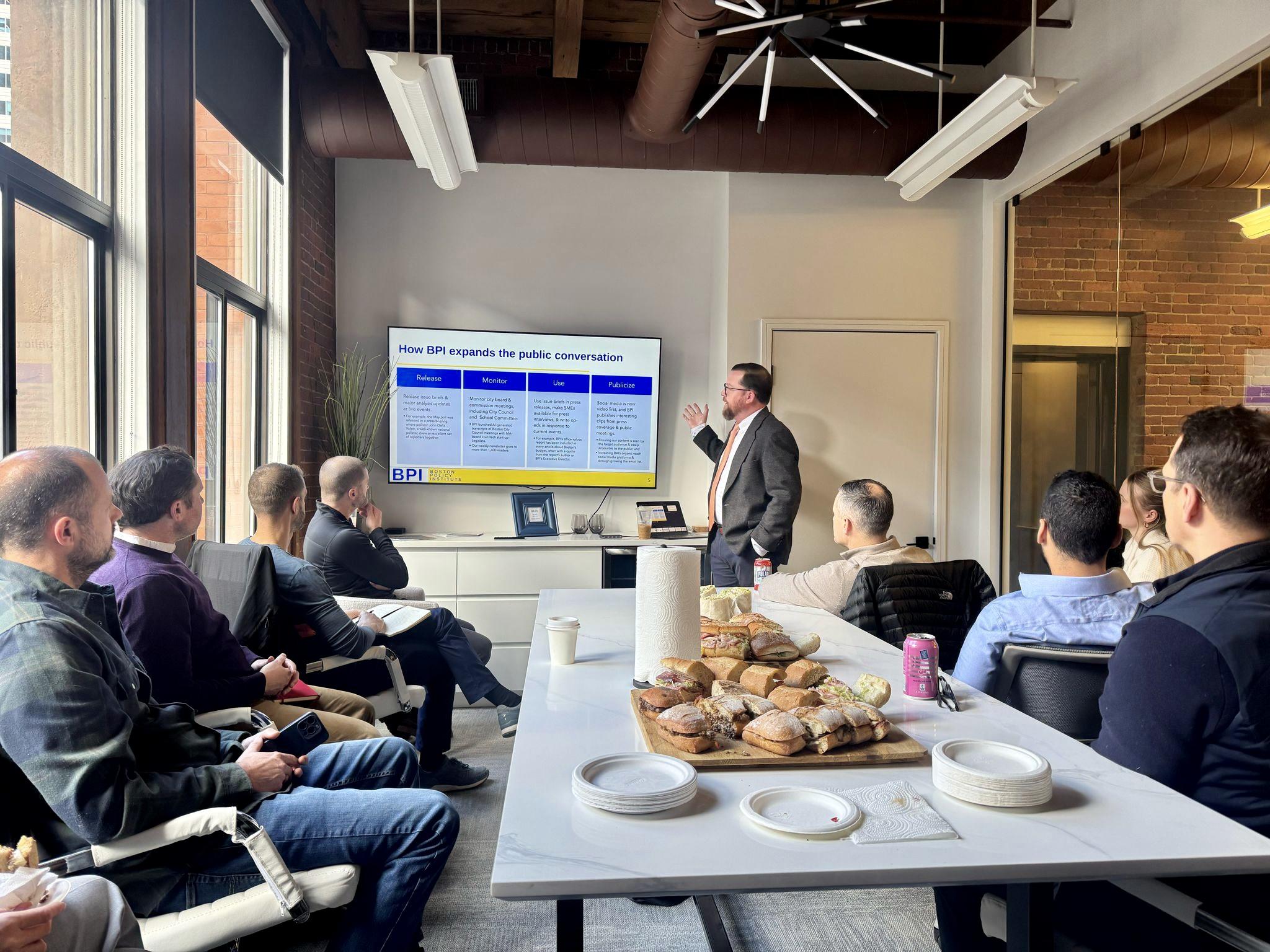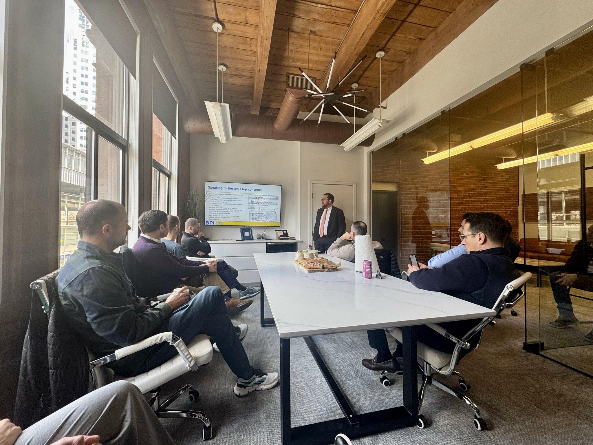 Yesterday, alongside Tom Colleran of BuildBoston we brought a dozen plus Boston area developers into the office to hear Greg Maynard of Boston Policy Institute tell about many of the big picture issues (city and state revenue sources, impacts of commercial and residential taxes, major development and zoning discussions) that he presents on a regular basis to City and State officials, City Councilors and C-suite Executives.