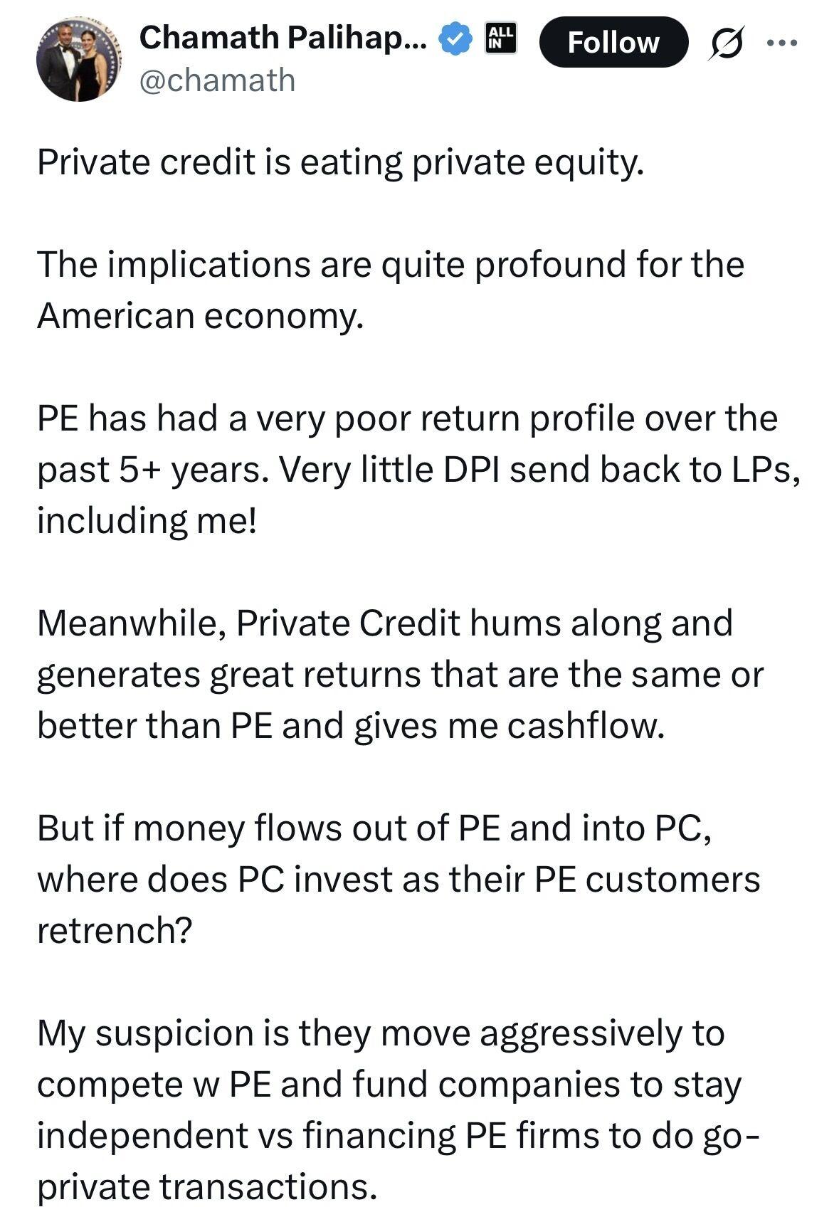 And too CP's point if private credit grows more than the equity side (i.e. less PE capital for acquisitions), than where does the debt/credit capital go…